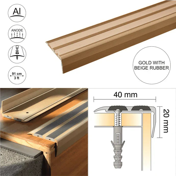 SA11 40 x 20mm Anodised Aluminium Non Slip Rubber Stair Nosing Edge Trim With Insert